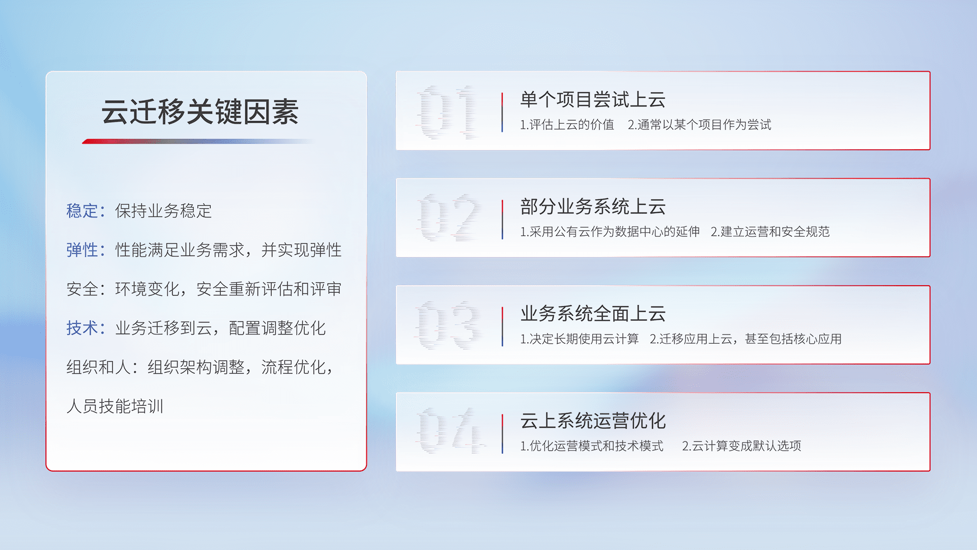 结合实际业务,,,,从规划设计、、云平台选型、、、云原生改造、、数据迁移、、、、集成交付,,,,迁移全过程为客户识别最佳上云路径,,做好风险识别管理,,设计网络架构、、、、身份权限、、安全审计合规、、操作审计、、日志审计、、、、监控告警策略、、多站点容灾设计等,,对云上基础设施进行整体规划,,,提升IT治理水平,,,以满足弹性、、高可用、、高性能的需求。。。