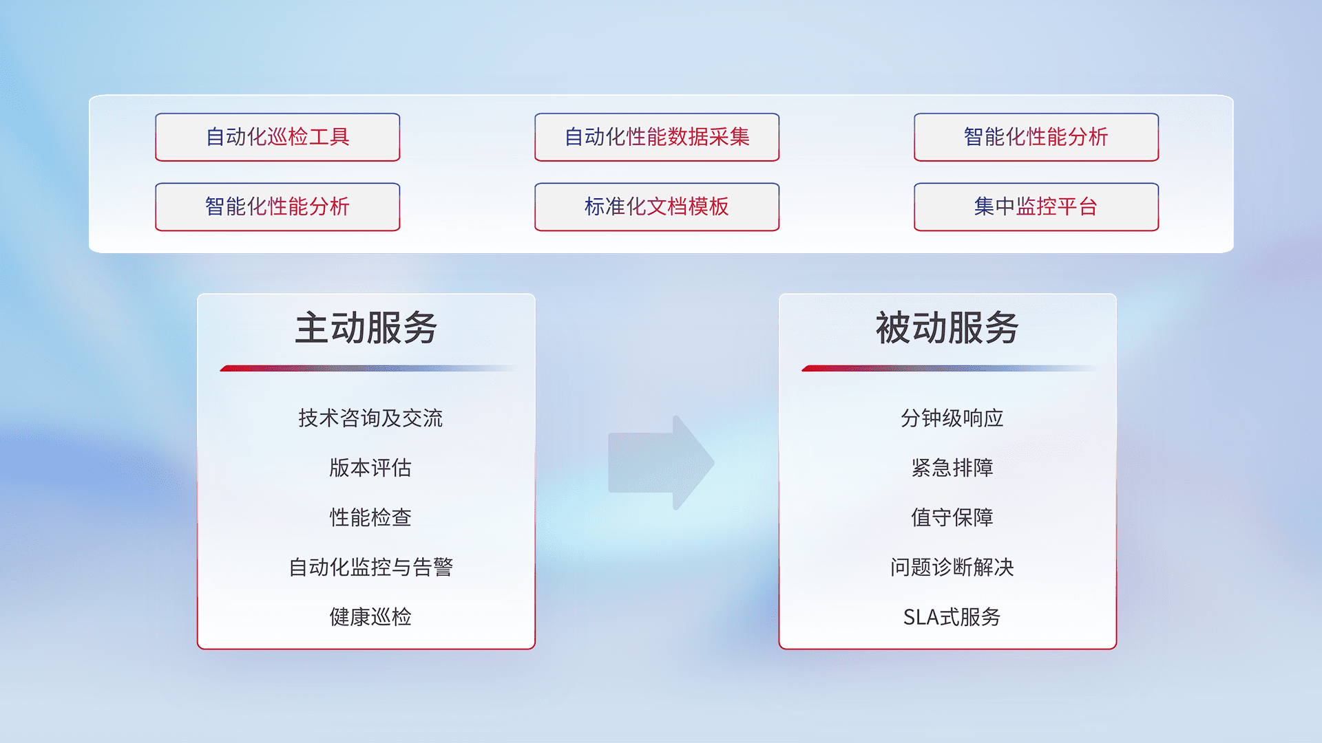 智能化工具和标准化文档,,,,保障服务质量,,提供主动服务(包含技术咨询、、版本评估、、性能检查、、自动化监控与告警、、、、健康巡检)和被动服务包含(分钟级响应、、、、紧急排障、、、、值守保障、、、问题诊断解决、、SLA服务)。。
